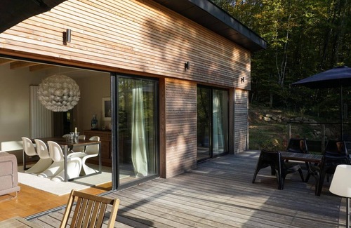 Inside, this cottage is decorated in a contemporary spirit. Warm and bright living room equipped with a fireplace with stove (free wood), kitchen area, 1 bedroom with 1 160 cm bed (2x80), 1 bedroom with 1 double bed, bathroom, separate toilet. Beds made on arrival, towels provided. Gîte equipped with washer-dryer, flat screen TV, DVD player, Bluetooth speaker, library, video library, telephone and wifi internet access. Electric heating included. Prices all charges included. Cleaning service €60. Isolated cottage. Access by private road for 500 m.