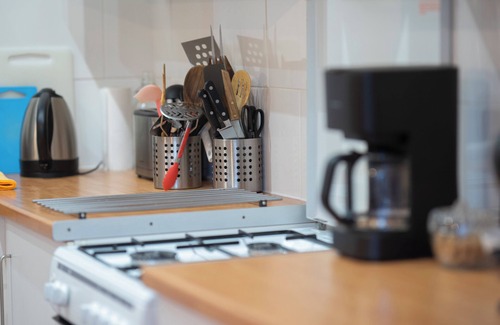The kitchen is equipped with an oven, a stovetop, and a refrigerator, as well as a coffee maker, an electric kettle, and a microwave. Bathroom amenities include a hair dryer, towels, and toilet paper. And you can even pack a bit lighter because there's a washer and dryer. Other amenities include bed sheets, an ironing board, housekeeping, and heating.