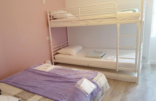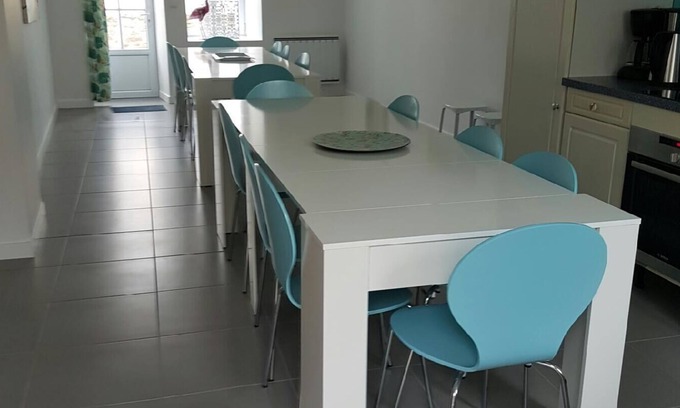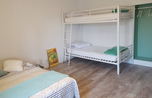 It includes 4 bedrooms of 4 to 5 people for some, 2 bathrooms 3 WC and dining room with kitchen + a small lounge (with a sofa bed) + an outdoor courtyard. Additional parking spaces are available near the house.