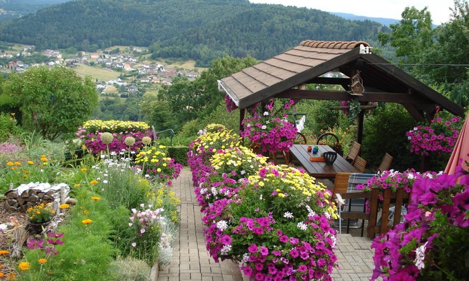 From our cottage, you will enjoy a soothing, green with an exceptional panoramic view of the Vosges mountains, a large outdoor area fenced 17 ares. You will have a terrace very nice, spacious and flowery.