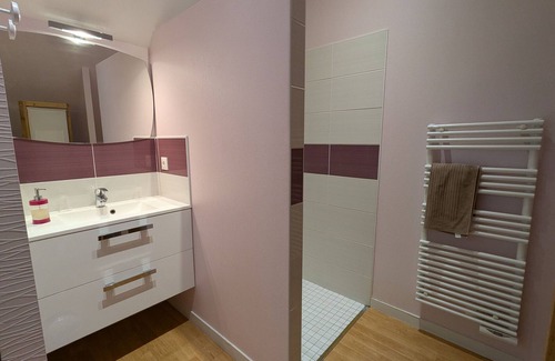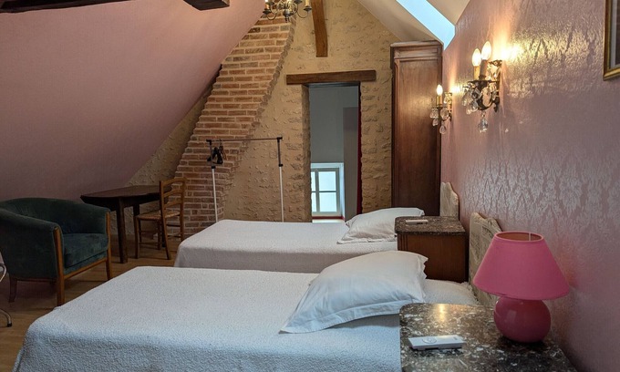 15 km from Orléans, within the walls of an old fortified house, on an organic farm (fruit and vegetables). An old building has been renovated with its exposed stones and fresh colours. You will be in a quiet area, between the Loire Valley and the forest, close to many places to visit including Orléans. On the same site, 2 gîtes for 5 and 4 people. In an independent building, on the ground floor, 1 with direct access via the terrace. Ground floor: living room/lounge with wood stove (wood provided), fitted kitchen, Bedroom No. 1, accessible for people with reduced mobility (2 single beds) with its adjoining bathroom (shower, toilet, sink).