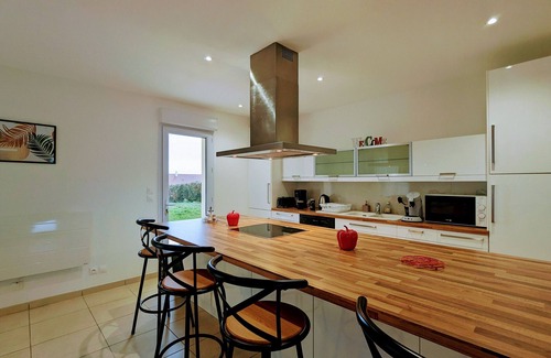 Located in Vicq-sur-Nahon, just a few kilometers from Valençay and its majestic castle, you will have the opportunity to explore the rich history and treasures of this beautiful region, not to mention the Zoo Parc de Beauval. Whether for cultural adventures or moments of serenity in the countryside, our seasonal rental house offers you the perfect starting point for an unforgettable vacation. Living space: our living room is the ideal place to relax with family or friends. It has a lounge area with two cozy sofas, perfect for lounging after a busy day. The dining area is equipped with a large table where you can share delicious meals and precious moments. The kitchen, located nearby, is fully equipped and has a central island, providing an ideal preparation space for cooking enthusiasts.