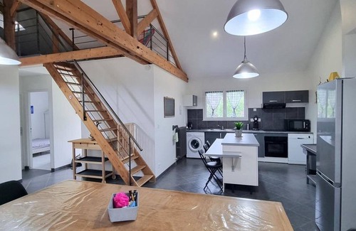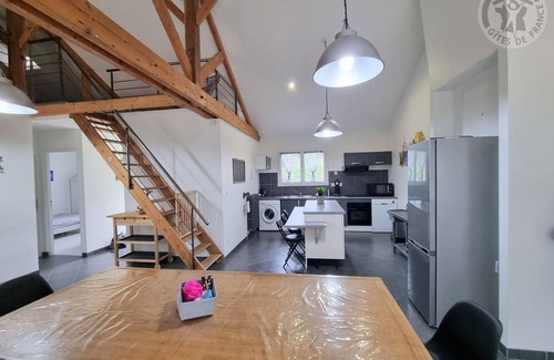 Large living room with dining table for 10 people, cathedral living room. Open and equipped kitchen with fridge-freezer, dishwasher, washing machine, Senseo pod coffee machine, electric oven, microwave, 4 induction hobs. Living room, 80cm TV.