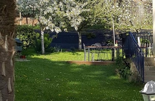 Unfenced garden of approximately 800 m² with garden furniture, barbecue and ping-pong table.