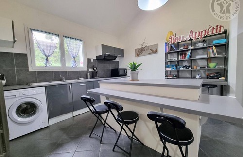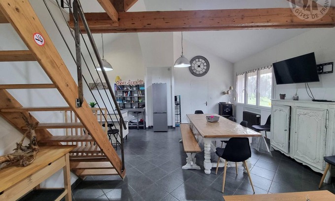 First gîte: Large living room with table for 10 people, cathedral living room. Open and equipped kitchen with fridge-freezer, dishwasher, washing machine, Senseo pod coffee machine, oven, microwave, 4 induction hobs. Living room with sofa, 80cm TV. Bathroom with bathtub and shower screen, a separate toilet. 2 bedrooms with 2 90x190cm beds each (double bed possible in one of the bedrooms). Relaxation area on a mezzanine with a sofa bed.