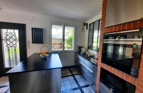 On the ground floor, fitted kitchen area, living room with fireplace (free wood insert), flat screen TV, internet access, connected speaker and DVD player, 1 spacious and bright bedroom with 1 160X200 bed, 1 bedroom with 1 double bed people, bathroom with bathtub and shower, 2 separate toilets and laundry room with washing machine and dryer. On the 2nd floor, 1 bedroom with 1 160X200 bed, 2 bedrooms with 1 single bed, 1 bedroom with 1 double bed, bathroom with WC and large relaxation room with table football and library. Beds are made on arrival and bathroom linen provided. Electric heating included. Prices all charges included.