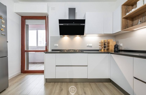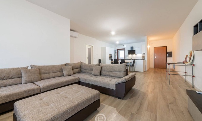 Upon entering, you will be greeted by a bright and cozy living room, featuring a comfortable sofa and a Smart TV, ideal for relaxing after a day of exploration. The adjacent kitchen, fully equipped, allows you to prepare delicious meals at home, offering all the necessary tools, from a coffee machine to an oven.