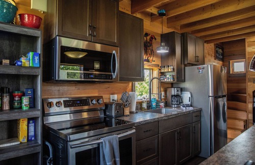 2-story cabin with warm wood interiors and panoramic windows. Comfortable master bedroom with a cozy queen bed. Full bathroom with shower/tub and rustic cabin décor. Fully equipped kitchen with stainless steel appliances, island seating, and all cooking essentials. Washer & dryer tucked under the staircase
