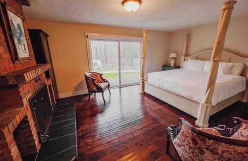 This beautiful property boasts a parklike acreage where you can interact with the farm animals including horses, baby goats, chickens, bison and alpacas. You will be staying in a beautiful lodge, where rustic meets refined. This is a place that you can enjoy meals in our gourmet kitchen, watch the game or have movie night in our media room, relax and read a book in our window wrapped living room or roast marshmallows by the outside fire. Forget your worries in this spacious and serene space.