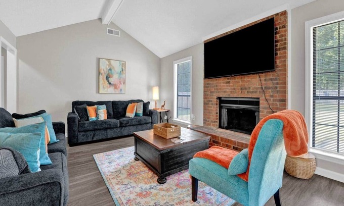 The place is ready and perfect for a family gathering, different occasions, or football game head quarters. Livingroom Step into the cozy and spacious living room, designed for comfort and relaxation. It features two plush sofas perfect for lounging with family or friends alongside a charming fireplace that adds a warm and inviting touch. Enjoy your favorite shows or movie nights on the wide flat-screen TV , making this the perfect spot to unwind after a day of exploring or relaxing indoors.