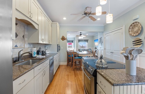 - Fully Equipped Kitchen: The eat-in kitchen features a large ceramic tile bar and is fully stocked, making it easy to prepare meals for gatherings or celebrate with family and friends.