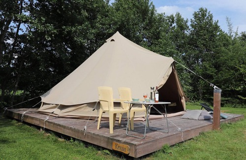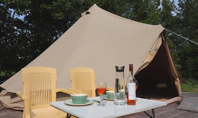 This beautiful large Glamour tent stands on a wooden platform and is tastefully decorated. A small fire pit has been created next to the tent, with a tripod with a pan above it. When you unzip the back entrance of the tent, the made-up spacious double bed offers a view over the sheep pasture. You can cook outside on a wood fire, or you can use the public kitchen facilities at the campsite. There is a solar panel to charge your phone. Really nice in nature and ideal for a couple possibly with a little one. This beautiful small-scale nature park is located in The Frisian Woods, directly on a cycling node route. So get on and cycle a beautiful route. It lies between the nature reserves of Lauwersoog, ""t Bûtefjild and the Twijzeler Mieden. Be surprised by the beautiful Frisian coulisse landscape that makes this region so characteristic. The Elfstedenstad Dokkum is close by and Groningen or Leeuwarden are also within easy reach.
