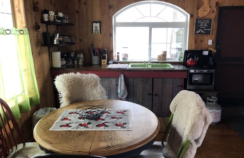 The property is completely off the grid, making it very appealing to those travelers and adventurers who want to create a minimal carbon footprint on their vacation. The kitchen sink has a hand pump that draws water from under the sink from a 10 gallon water jug. We have a new underground water storage tank with a frost free hand pump, which will provide all the water you will need for your stay. We have built a little rustic outdoor shower, which you are welcome to use. There is a shower bag for your use (as long as the wind hasn't blown it to Snowbowl), however you may prefer to bring your own. We recently installed a solar powered lighting system and cell phone charging capability. There are no regular power outlets. Cell service is available in the area depending upon your carrier. The outdoor composting toilet is super clean with little or no odor.