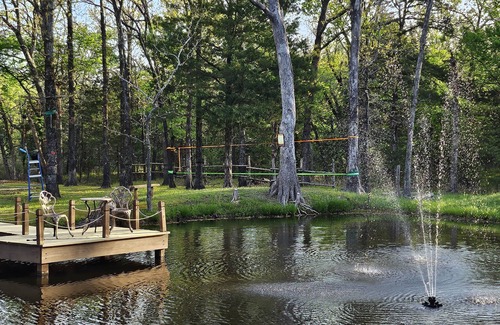 Outdoor enthusiasts tired of skyscrapers, cars on the street, & busy people running around? Bring your family & friends to enjoy this lakefront cabin with a gorgeous mountain view! Our cabin by the beautiful Sardis Lake in Oklahoma has 2.5 acres of land full of wild life. A private stocked fishing pond & outdoor playing area with zipline, slackline, hammock, tree-climbing kit, fire ring, BBQ grill, & game machine will make everybody happy if swimming, boating, fishing & hunting are not enough!
