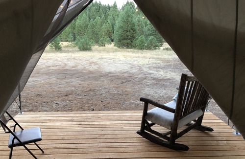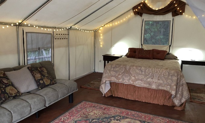 Beautiful natural setting with view, furnished Glamping tents. Wildlife viewing, Butterfly Pavilion onsite. Guests have free access to the Butterfly Pavilion, Natural Playground and Missing Links Mini Golf Discovery Trail when open (Mid May to October). Easy walk to the river. Hot shower and kitchen. Locally trails available, giant redwoods or river rafting, 30 minutes away. Full year family membership for the Butterfly Pavilion is included! Instant booking is available but no same day bookings after 4pm. No smoking inside or out. Guests must agree to wildlife preserve guidelines.