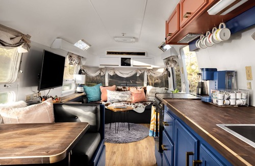 All the extras have been tastefully added to this vintage Airstream. The host offers a superb coffee bar!!!. Comfortable, fluffy bedding, warm rugs... All you can hope for while taking in the fresh air and starry sky with no light pollution. And don't forget smores made by the fire in your Solo firepit.