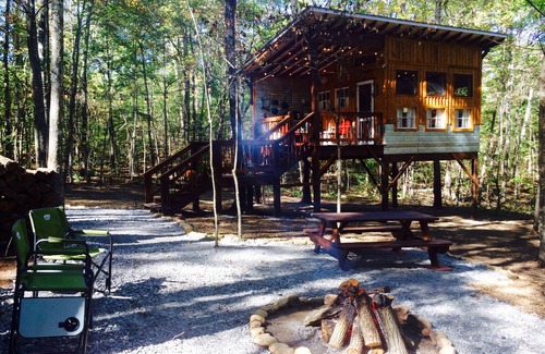 Deer Camp is a complete glamping experience! It is a 12x12 tree house cabin that is superbly COZY!! It's camping with modern conveniences and without having to pack up the house.