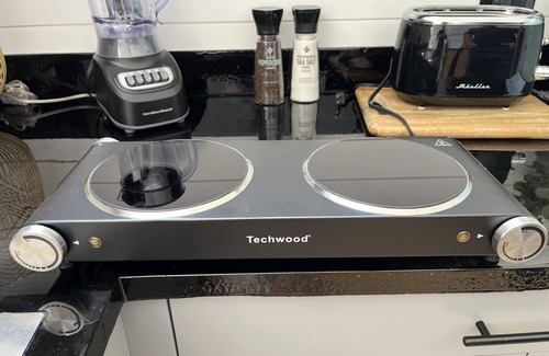 * Kitchen & Dining Area: Equipped with a two-burner stovetop, microwave, and air fryer for convenient indoor cooking.