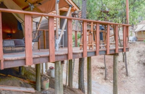 Located in a dreamlike setting surrounded by forests and mountains, this luxury tent offers a unique experience of comfort and tranquility. Our tents feature a queen-size bed with bedside tables and a covered outdoor seating area.