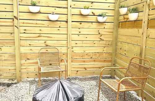 Inside, you’ll find cozy, Insta-worthy décor, a fully equipped kitchenette, & all the comforts of home. Outside, enjoy your privately fenced in patio with string lights, a fire pit, outdoor shower, and private parking area.
