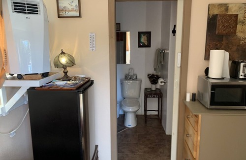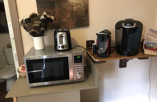 There is a microwave and a small refrigerator, a Keurig coffee maker, coffee and a toaster for some light cooking needs. We also have a propane barbecue grill outside for your exclusive use. There is a TV with a DVD player hooked up (only about 7 channels on TV but a RedBox is only 4 miles away.) There is a twin mattress on a Captain's bed along with a camp cot with a very nice mattress topper on it. Plenty of bedding to keep you cozy! We supply towels and plenty of cleaning supplies for you too!