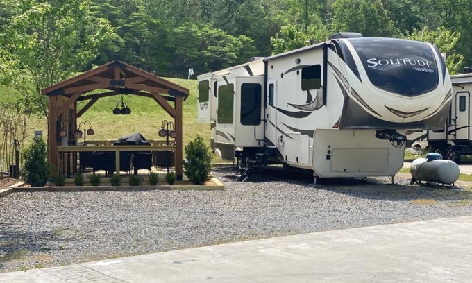 Pamper yourself in this luxury 2017 Solitude by Grand Design recreational vehicles. This luxury RV is permanently set up on site 55 in a private and gated community known as Waterside at Blue Ridge, Blue Ridge's newest premier tiny home and RV community. All paved access and less than a mile from Hwy 515. A perfect location which puts you close to everything Blue Ridge and the surrounding areas have to offer. The owner (an Interior Designer) offers this luxury RV for your solitude and relaxation. Trust in knowing that with his expertise in comfort and visual appeal this RV is done right. Directly outside of the RV you can lounge in your private gazebo (added March 2022), with covered dining, upscale decor and mood lighting. A perfect place to enjoy your meal cooked on the charcoal grill located at the back of the gazebo. In the evenings enjoy your own private firepit with seating, also located at the back of the gazebo. Inside you will find one bedroom with a king size bed with crisp 100% organic cottonseed sheets and a wall mounted TV. The bathroom has a full-size shower and vessel sink with thick and fluffy towels. The kitchen is equipped with a full-size refrigerator, a convection microwave, a combination Keurig coffee pot capable of traditional drip brewing or K-cups, a three-burner gas stove, a gas oven and a double stainless-steel sink. The indoor dining area off the kitchen seats four. In the living room you can lounge in one of two comfy loveseats or take a well-deserved nap in the reclining theatre seats. The electric fireplace and large screen TV in the living room will certainly help you unwind and enjoy your stay.... perhaps watch a movie from the large DVD collection. Bring popcorn! Also....a mini "google home" are located in the dining room and bedroom. Just ask "Hey google, what's the forecast today?" get music, temperatures, phone numbers and more, simply say "hey google...…" and then ask your question. Also please feel free to inquire about special occasion packages that are set up prior to your arrival. Flowers, Charcuterie boards, cakes, pastries and balloons are available at an extra charge. All the amenities within Waterside at Blue Ridge are at your disposal. Amenities include a saltwater swimming pool, (the pool is closed from October to May) a 12 person shared hot tub which is open year-round, a public outdoor clubhouse with seating and a TV. Check out the outdoor pizza oven at the pavilion and create your own homemade pizza. There are three upscale showers in both the ladies and men's public restrooms as well as laundry facilities. Located off the public clubhouse you can lounge on the open deck overlooking the pond which is at the center of this community. Fishing is permitted in the pond although it is catch and release. A short walk within the community you will find a rushing creek which is a stone's throw from the community playground. Bring a blanket and picnic basket and enjoy a picnic while listening to the rushing water. Or perhaps meet new friends at one of the public outdoor firepits or join in on a game of basketball or pickle ball at the public courts. Basketballs are available for rent at the pavilion, or you are welcome to bring your own. Golf carts are also available for rent on a first come, first serve basis. While at the pavilion please check out the bulletin board for any special events that you are welcome to attend and enjoy. Should you choose to venture out and explore the area the Blue Ridge Marina, Lake Blue Ridge and downtown Blue Ridge are approximately a 10-15 minute drive from Waterside at Blue Ridge. Other nearby attractions include but are not limited to---Brasstown Bald (the highest point in Georgia), 33.9 miles--- Blue Ridge Scenic Railroad, 7.5 miles---The Ocoee Adventure Center (whitewater rafting, kayaking and more), 19.2 miles--Appalachian Trail Rides, 8.3 miles---Blue Ridge Marina, 4.4 miles----Morganton Point (public beach and public boat launch), 1.2 miles----Serenberry Vineyards, 5.4 miles----Mercier Orchards, 8.6 miles------Toccoa Riverside restaurant and lounge, 13.6 miles----Rolling Thunder River Company, 12.9 miles-----Nottely Dam public beach and boat launch, 11.9......Walmart and Ingles Market are 5.6 and 5.3 miles away.