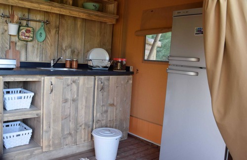 For nature lovers we offer 2 Luxury tents elegantly furnished, complete with every comfort. Full kitchen with dishes, double bedroom with four-poster bed, room for children with 3 beds, one bunk.