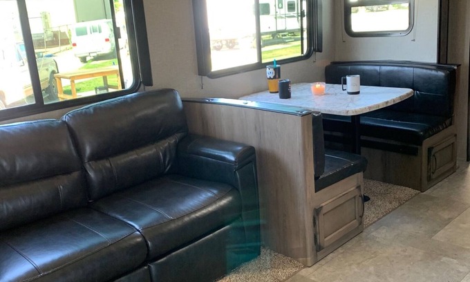 2019 Grand Design by Transcend, 300+ sq ft, 38' long RV. Like new, only taken out 5 times. Parked in our Big Backyard, surrounded by a 6' privacy wood fence, in a quiet, 'out in the country' neighborhood, waiting just for you. Volleyball, corn hole, BBQ grill, & frisbees, are available for your fun OR free wifi and quiet surroundings if you need to work. Perfect for 2 adults and 2 kids (possibly 2 more 'little' people) OR 1 adult needing some peace and quiet. IH-35 is 2 miles to the east. SH-45 is 3 miles to the west. Great location to all things in Central Texas!