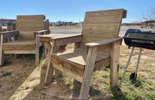Guests can enjoy the fresh air outside on our wooden chairs. Whether you're in town for work or simply seeking a romantic escape, our county camper is the perfect place to unwind and rejuvenate.