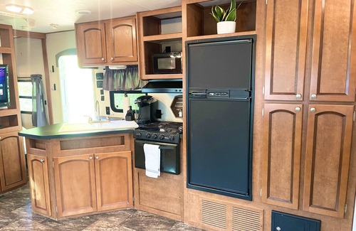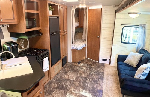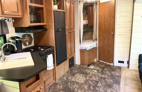 A residential queen sized bed can be found in the master bedroom. Privacy doors can be closed to section the master room off from the rest of the camper. A camper sized bunk is perfect for the kids sleeping arrangements. Please note these bunks are not the traditional twin over twin size. The top bunk is slightly smaller than a twin and the bottom bunk is between a twin and full size. The bunks can be “privately” closed off by a black out curtain however there is no door to close to cut off access to these beds. There is also a futon provided for one additional guest. All linens are provided for each bed, if you need anything extra just let us know and we will do our best to accommodate any needs.