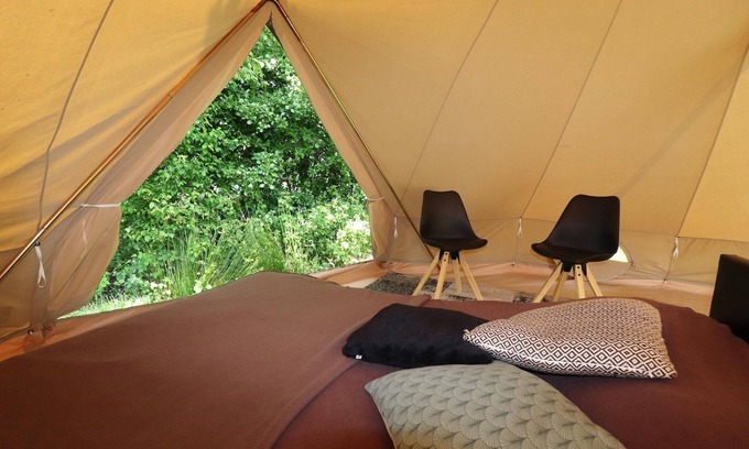 This charming glamping tent lodge offers a truly immersive nature experience in the heart of De Friese Wouden. Nestled on a wooden platform with views over peaceful sheep pastures, the bell tents are tastefully decorated and exude rustic comfort. Each tent has its own fire pit with a tripod pan for outdoor cooking, while a shared kitchen at the nearby 4-star campsite provides modern convenience. The rear of the tent opens directly onto serene green landscapes—perfect for a quiet morning coffee or a romantic sunset moment. Surrounded by stunning nature reserves like 't Bûtenfjild, Twijzeler Mieden, and Lauwersoog, this location is a paradise for hikers, cyclists, and bird watchers. Rent a bike and set off directly from the campsite along scenic cycling routes. Visit the historical city of Dokkum, one of the famous Frisian Eleven Cities, or take a day trip to Leeuwarden or Groningen for culture and shopping. The sandy recreational beach at Schuilenburg is only 4 km away, ideal for a refreshing dip in summer, while nature lovers shouldn’t miss Nationaal Park De Alde Feanen, just a short drive from the property. After a day of exploring, treat yourself to some local flavours at nearby eateries. For a hearty meal with regional flair, try Pannenkoekhuis Bergumermeer near the lake, or enjoy a seasonal menu at Het Posthuis in Dokkum. If you’re headed toward Leeuwarden, Proefverlof in the Blokhuispoort offers creative dishes in a unique, historic setting.