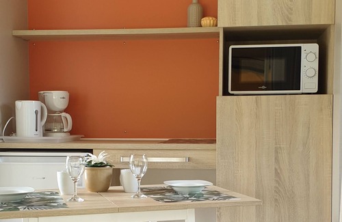 Layout: Ground floor: (Living room(electric kettle, coffee machine(filter), microwave, fridge), bedroom(double bed), bedroom(single bed, single bed)) parking, swimming pool(shared with other guests, outside)