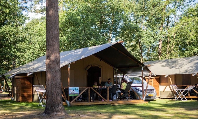 Waking up to the chirping of the birds, as you wake up on a soft mattress. Your own shower and then breakfast on the veranda while waving to the neighbours. The kids can't wait to join the kids' club or swim. You yourself enjoy the peace and quiet while grabbing a cold drink from the fridge. That's the feeling of luxury camping you can experience here
