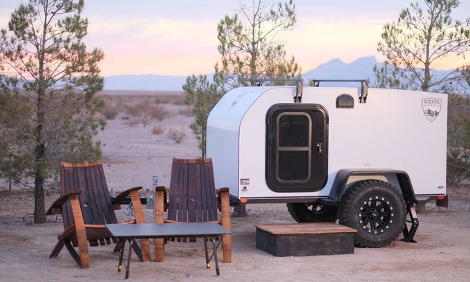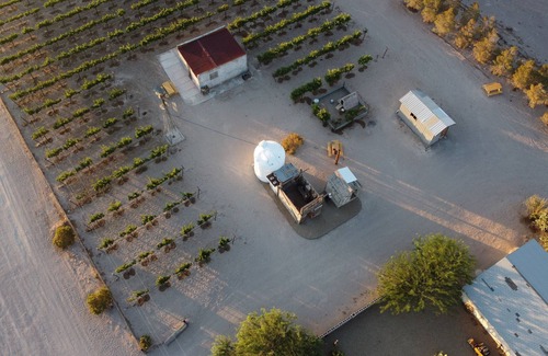 Stay the night in one of our teardrop trailers located next to our small family vineyard outside of Death Valley National Park. It includes a queen size bed with clean linens, lockable space with electricity and heater, adirondack chairs, and table. Shared composting outhouses are located adjacent to your trailer and an outdoor shower with hot water is available by donation. This is a walk-in site roughly 100 ft from your reserved parking space.