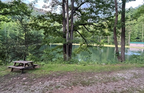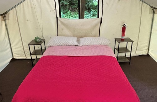 Camping with a touch of creature comfort = Glamping. This is a canvas safari tent with a blow up couch sleeper and comfortable bed for two. Situated overlooking our 3-acre stocked fishing' pond with easy access to our bathhouse, hiking trail entrance, and camp store. Linens are provided. It is not 100% bug or critter proof, so please don't leave food or trash out. Amenities include solar powered lights, and charging station. Come stay on the hill and watch the fish jump.