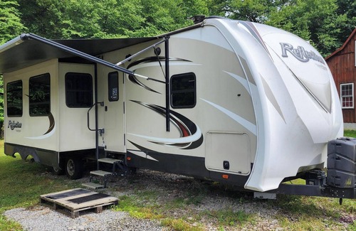 Glarus - Riverside 36' RV, trout stream firepit | RV Rental in Helvetia