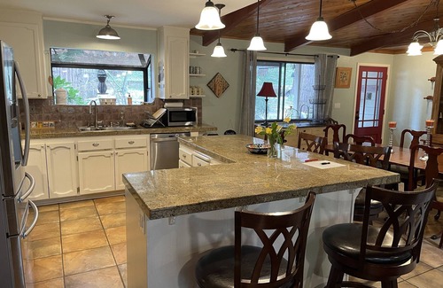 This remarkable house features a spacious open floor plan, complete with hardwood floors, a modern kitchen island, and a cozy private office with high-speed internet – ideal for any last-minute preparations. Enjoy movie nights on the 50” Smart TV equipped with platforms like Disney +, Hulu, and Amazon Prime Video. Unwind on your private deck overlooking the serene pond or host gatherings in the charming gazebo. With ample parking and accommodations for up to 20 guests for wedding rehearsals and events, Glenbrook House is designed to cater to your every need.