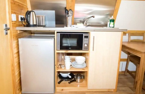 Our fully heated wooden cabins are warm and cosy with a double bed and sofa bed. The cabin has an en-suite shower room with a hand basin and toilet. There is a small Kitchenette fully fitted with fridge, microwave, toaster, kettle, two ring hob and sink.