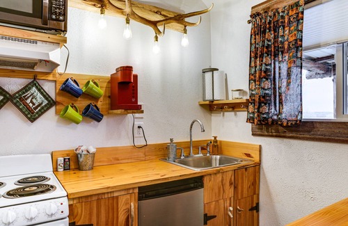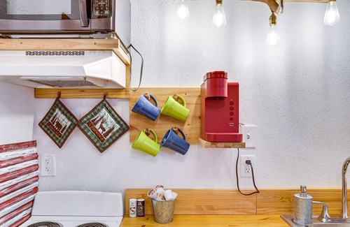KITCHENETTE: Cooking basics, microwave, mini refrigerator, stove/oven, Keurig coffee maker w/ coffee provided