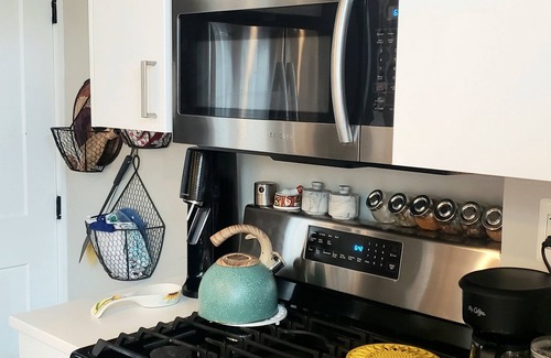 Fully equipped kitchen with stainless steel appliances, cooking essentials, and a curated spice selection for global-inspired meals.