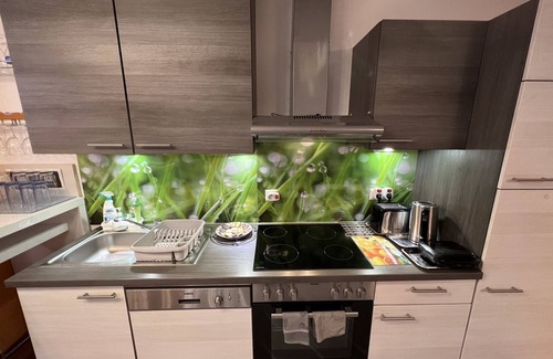 3-room apartment 100 m2, on the lower ground floor. Comfortable and modern furnishings: entrance hall. Large living/dining room with 1 sleeping facility, dining table, international TV channels and flat screen. 1 large double bedroom with 1 double bed and 1 sleeping facility. 1 small double bedroom with 1 double bed and 1 pull-out bed (1 pers. length 180 cm), bath/shower. Open kitchen (4 hot plates, oven, dishwasher, toaster, kettle, microwave, freezer, electric coffee machine). Sep. WC. Heating. Facilities: washing machine, dryer (extra). Internet (WiFi, free). Please note: suitable for families. Non-smokers only. Smoke alarm.