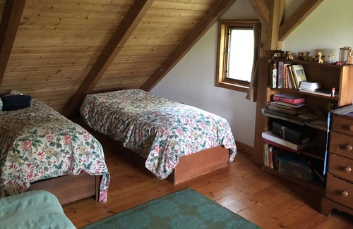 The first floor has a fully equipped kitchen -- dish washer, microwave, toaster oven, etc. -- with a counter that opens into the dining room. The dining room opens into the living room, both of which have floor-to-ceiling windows looking over the woods and miles of wooded hills and on over the Hudson River Valley, with not a house in sight! The dining room opens onto the wrap-around deck. Also on the first floor is a half-bath and a den with a pull-out couch.