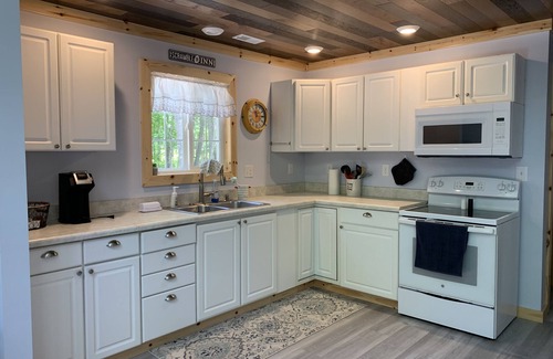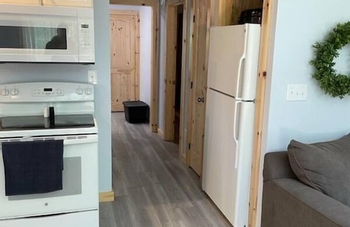 Inside the cabin we have tried to make it as comfortable and welcoming as possible. We have stocked the kitchen with some of the most used items, salt, pepper, spices, coffee, etc. There is a k cup style coffee maker, as well as a regular coffee pot. The living room is cozy with an electric fireplace. There is heat and ac. The bedrooms are spacious and inviting.
