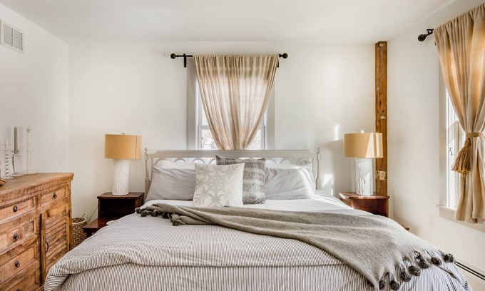 Wake up in a bedroom steeped in woodsy charm via exposed wood beams, a timeworn wooden dresser, and a driftwood-framed mirror. Rustic-chic touches in a cozy living room unite with a kitchen’s modern flourishes forging a radiant, lived-in atmosphere. This first floor apartment of a two unit 1830 farmhouse can be rented on its own or with the upstairs unit. Booked as just the first floor, it is completely secluded with its own private entrance.