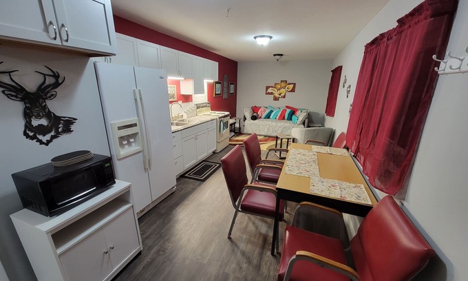 This rural suite offers a retreat into a unique, wooded environment with walk trails, full of God's created flora and fauna! 3 miles to town and 40 miles to Des Moines, 15 miles to Sprint Car Racing, and 30-60 miles to 7 State Lakes!