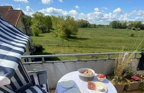 The light-flooded 3-room non smoking apartment with balcony?Godewind 9? is surrounded by meadows and offers a magnificent view of the Tarnewitzer jungle. In the with 3 *** certified holiday domicile find up to 4 persons on 60qm living space much comfort. In the bright and lovingly furnished living-dining area with rattan sofa, large dining table, flat-screen TV and music system is also a comfortable equipped kitchenette, which is easily separated from the living room by a bar. Of course, a dishwasher, as well as cooker with ceramic hob, oven, extractor hood, coffee maker, kettle, toaster, espresso machine available. On the balcony in south / east facing balcony furniture, beach chair and an electric grill are available. Two separate bedrooms, each with 2 single beds, ensure a restful night's sleep, and through the sloping roof windows, you can watch the stars of the Baltic Sea on clear nights. The apartment also has a bright tiled shower room with washing machine. You can park your car for free on the apartment's own parking space.