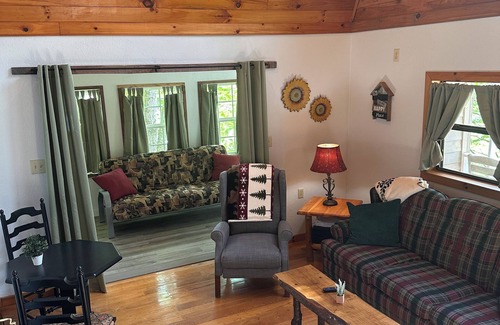 If you're looking for a spot to relax and take in the natural beauty, our cozy front porch is the perfect place. Overlooking the creek that runs beside the cabin, you can sit back in a comfortable chair, sip on a cup of coffee, and enjoy the tranquil sounds of the flowing water. It's an ideal setting for some peaceful moments of reflection or quality time with family and friends.