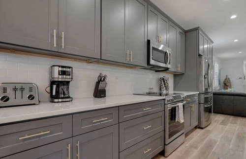 Walk into the spacious living space and full kitchen equipped with everything you need for your stay. A convenient 1/2 bathroom is available for guests at the entry of the home.