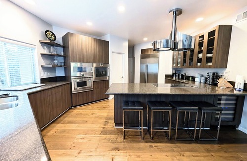 The heart of the home is a chef’s dream. The spacious, fully-equipped kitchen features high-end appliances, two sinks, and ample counter space, making it perfect for preparing a feast for your entire group.
