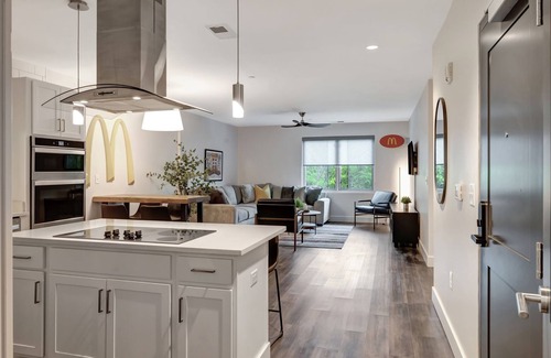 You will be welcomed by vintage McDonald's artwork throughout the unit. Upon entry, the full kitchen is striking with state of the art appliances and ample kitchen space to have a great meal from home. Right off the kitchen is a walk in laundry room with space to wash and fold clothing. The living area features a big comfy couch and smart TV to stream all your favorite shows an movies. Down the hall you will find out twin bunk room with two twin bunk beds and a work space. Directly next door is the walk in shower and bathroom! Further down the hall is the king bedroom and en-suite bathroom. There is a Kroger grocery store just across the street from the Lodge for any last minute groceries items or late night snacking needs that may come up! Have an electric vehicle? We have an exclusive EV charger just for you in our parking lot. Once settled, guests can explore the building's amenities, including a fitness center and steam room.